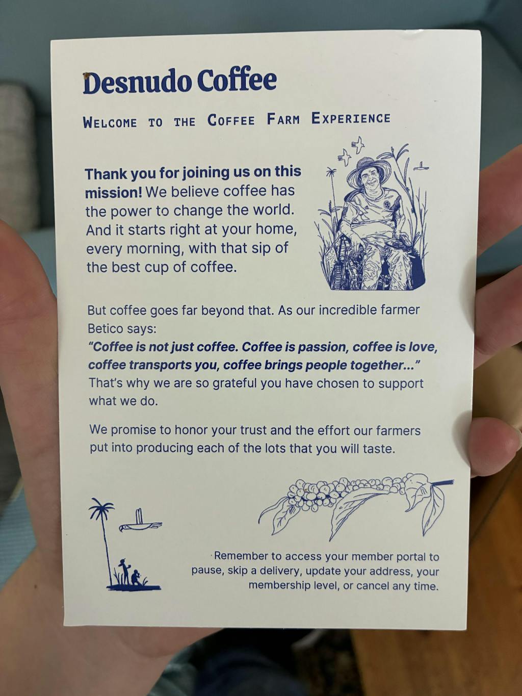 Love the membership! We have only gotten our first bag so far, but it has been delicious and well worth the money spent. Highest quality beans I have ever gotten have been from Desnudo and it really does make a big difference in the taste of your coffee, whatever time of day you enjoy it.